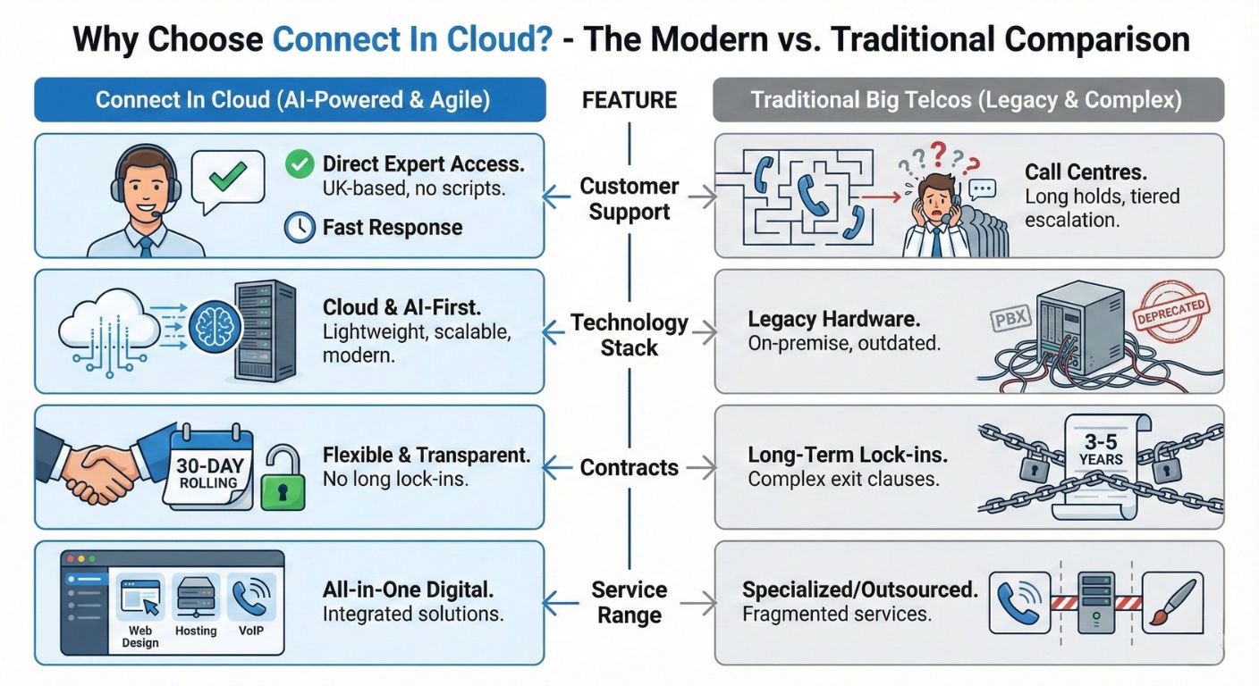 | Technology Stack | Cloud & AI-First. We use the latest lightweight, scalable tech stacks. | Often reliant on legacy on-premise hardware (PBX) and older cabling. |